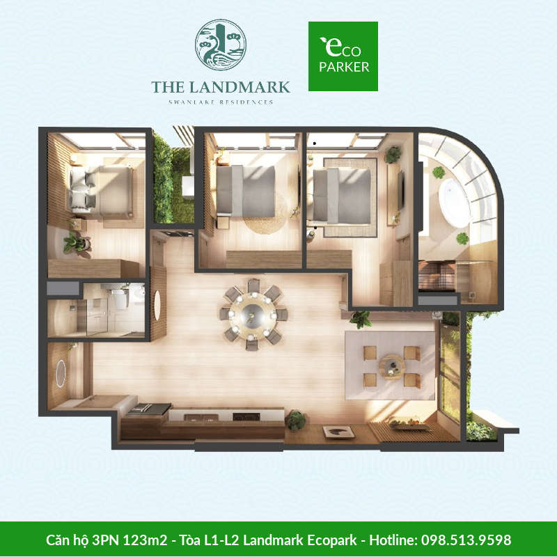 Căn hộ 3 phòng ngủ loại lớn ở Landmark Onsen Ecopark có diện tích từ 123m2, gồm có 3 phòng ngủ, 2 phòng tắm, 1 lô gia và bếp. Chỉ có 1 căn mỗi sàn là căn góc và có khoáng nóng dẫn trực tiếp lên căn hộ.